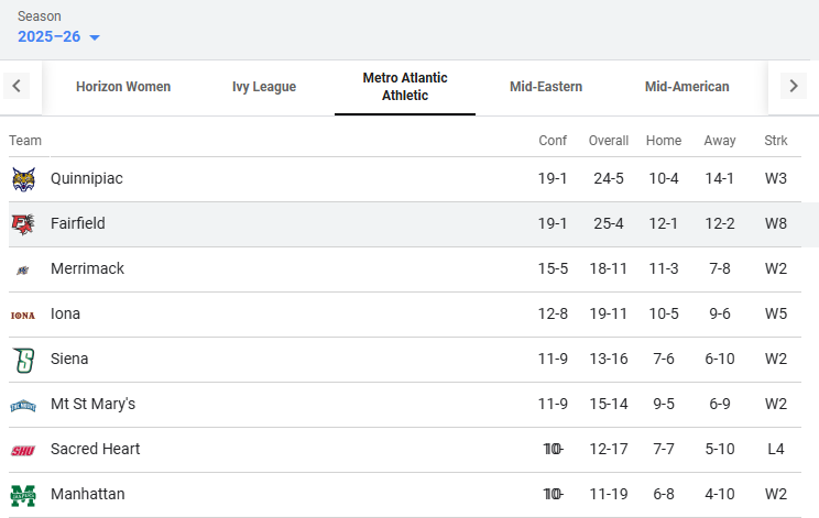 - Fairfield women finished 19–1 in MAAC play and share the regular-season title, but the No. 1 seed went to Quinnipiac via tiebreaker—so Fairfield’s margin for error is bracket-based, not standings-based.